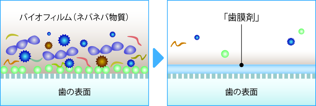 歯の表面は食べカスや細菌を引き寄せ、歯垢(デンタルプラーク)になりやすく、その上に細菌が積み重なって、粘着性の膜を作ります。この粘着性物質がバイオフィルムで、ブラッシングでは容易に落とせません。バイオフィルムは細菌の温床です。