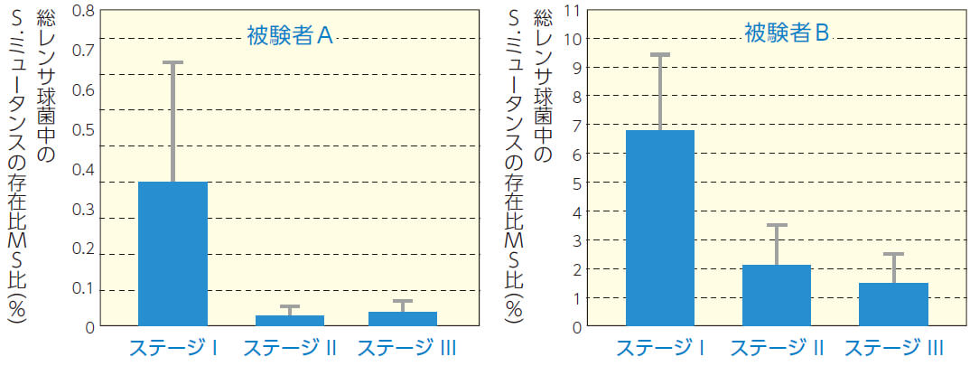 被験者A、Bの各ステージにおけるブラッシング歯垢のMS比