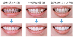 歯磨きは、エナメル質の上から磨くだけなので、生まれつき象牙質の黄色味が強い歯は、半透明のエナメル質を通して黄色味が強く表面に出ているので、磨いても白くなりません。また、抗生物質等で変色した歯も象牙質が変色しているので、いくら表面を磨いても白くなりません。
