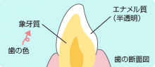 右図のように、歯の色とは、実は、エナメル質(半透明)を通して見える象牙質の色です。